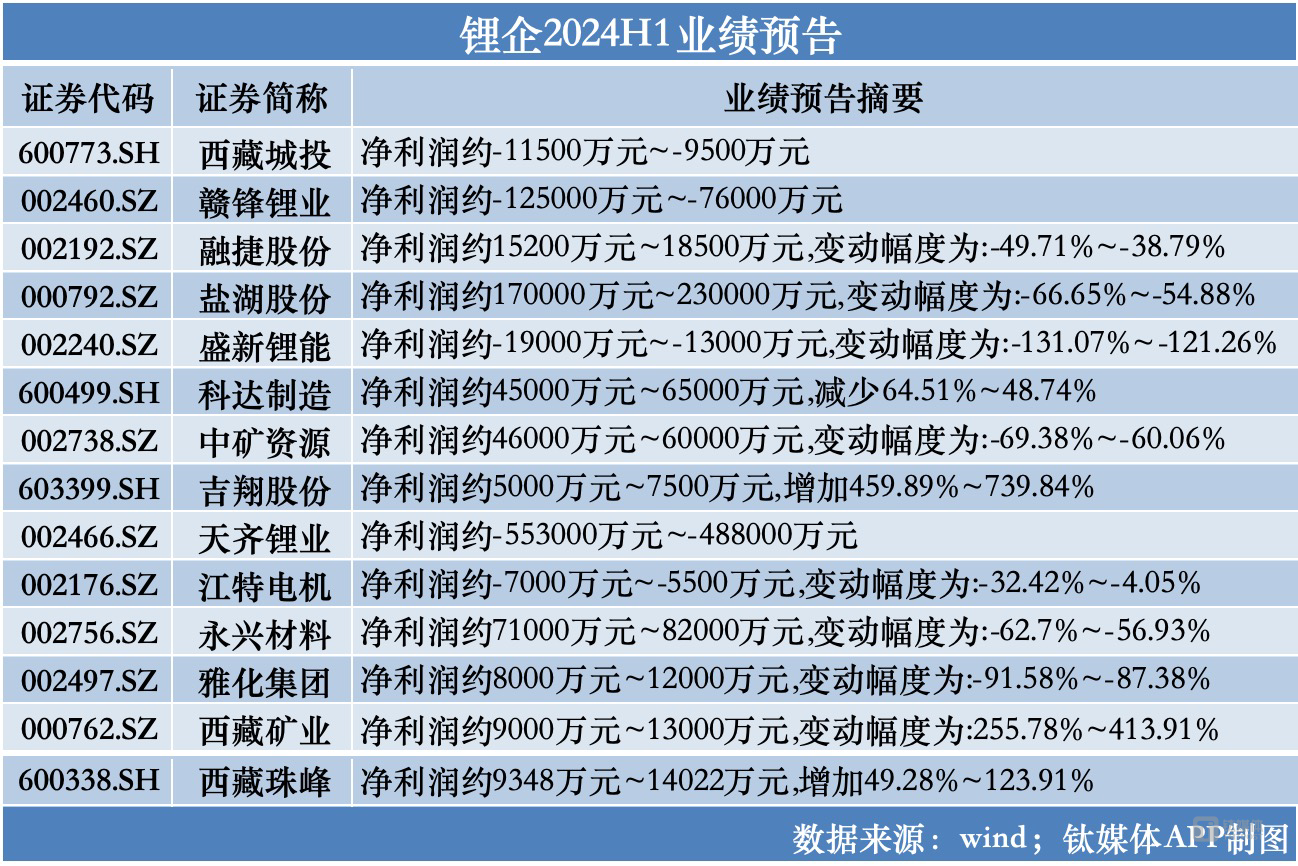 雅化集团(002497.SZ)、盐湖股份(000792.SZ)、永兴材料(002756.SZ)、科达制造(600499.SH)等盈利同比大幅减少。其中,雅化集团预计上半年净利润仅8000-12000万元,下降87.38%-91.58%。