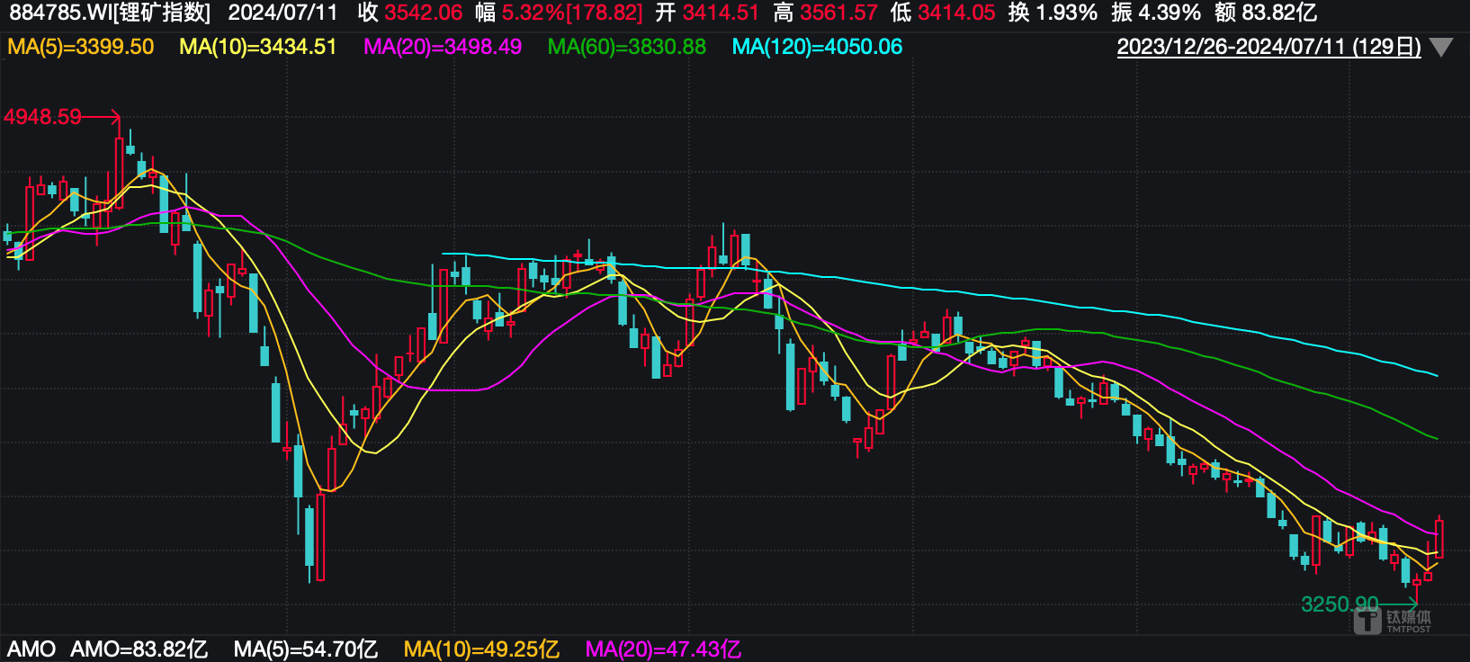 有意思的是,虽然业绩报忧,二级市场却给锂盐板块积极反馈。7月10日、11日,锂矿指数触底反弹,尤其11日,大涨5.32%。具体到个股,10日,西藏矿业大涨8.75%,领衔板块反弹;11日,盛新锂能、永兴材料、融捷股份更是集体涨停,雅化集团、中矿资源大涨逾6%。