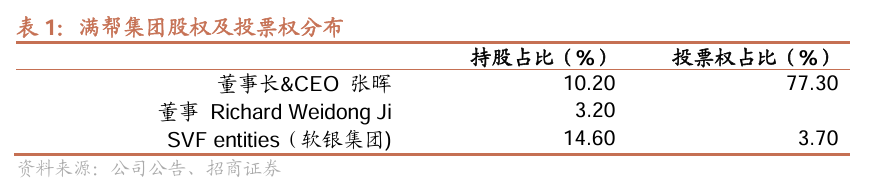 创始人投票权近80%,决策权集中。在公司股权结构中,原运满满CEO、现满帮集团董事长CEO张晖持股10.9%,投票权占比达到77.3%;公司董事Richard Weidong Ji通过All-Stars持股3.2%,不享有投票权。此外,软银通过SVF entities持股14.6%,投票权为3.7%。总体看,创始人张晖投票权近80%,公司决策权集中,股权结构稳定。