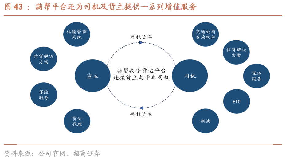增值服务:面向司机及货主推出多样化增值服务,完善全链路用户体验并增强黏性。公司针对平台上货主与司机的多样化需求,联合产业第三方,为用户提供运输管理系统、ETC、能源、卡车销售、信用和保险解决方案等一系列增值服务。对于货主端,满帮提供运输管理、信贷解决方案、保险服务及货运代理等货运周边配套服务;同时对于司机端,满帮提供交通处罚查询、信贷解决方案、保险服务、ETC及燃油等服务,满足司机的信贷保险需求及货车配套服务。增值服务除为平台增加增值服务收入外,还提升了司机及货主用户的用户体验及黏性。