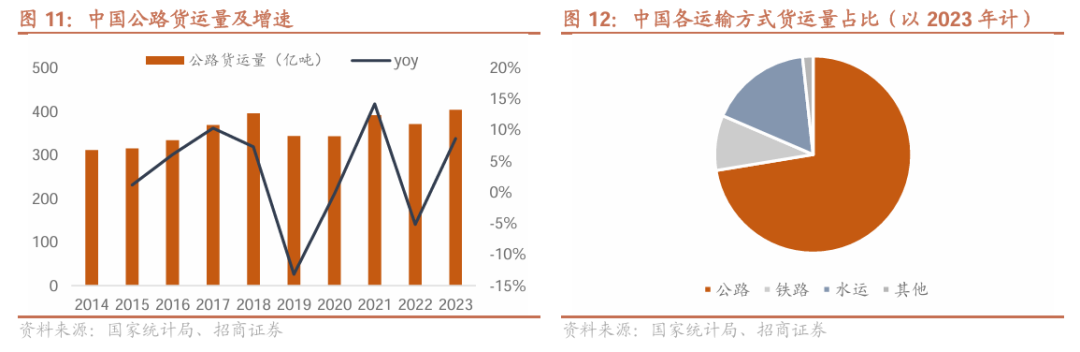 公路货运市场规模庞大,2023年规模约8万亿。根据沙利文数据(转自拉拉科技招股书),中国是全球最大的公路货运市场,2023年中国公路货运市场规模达到1.2万亿美元。根据国家统计局数据,2023年中国公路货运量403亿吨,占全国货运总量超过7成。2014-2023年,公路货运量年均复合增速约3%,整体呈现年均小幅增长,近年来受疫情和宏观经济影响呈现波动。随宏观经济持续复苏,中国的公路货运市场有望在商业活动增加及经济反弹的推动下继续稳健增长。