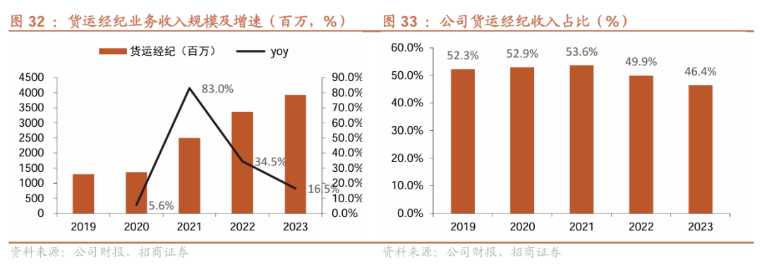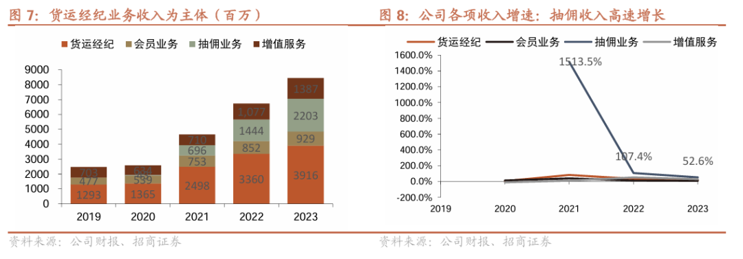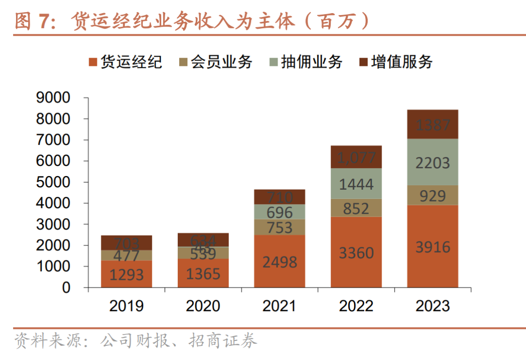 货运经纪收入占比超四成,抽佣收入增长明显。当前公司收入结构中,1)货运经纪业务为营收主体,收入占比超过四成,2023年全年实现39亿收入。2)公司会员服务收入也随货主数的增长保持逐年增长,2023年实现收入9.3亿。3)佣金收入方面,随公司收取佣金的城市逐步扩大及佣金率的提升,佣金收入实现可观增长,2023年交易佣金收入达到22亿。4)增值服务上,2023年公司增值服务收入约为13.9亿,增长约28.8%。