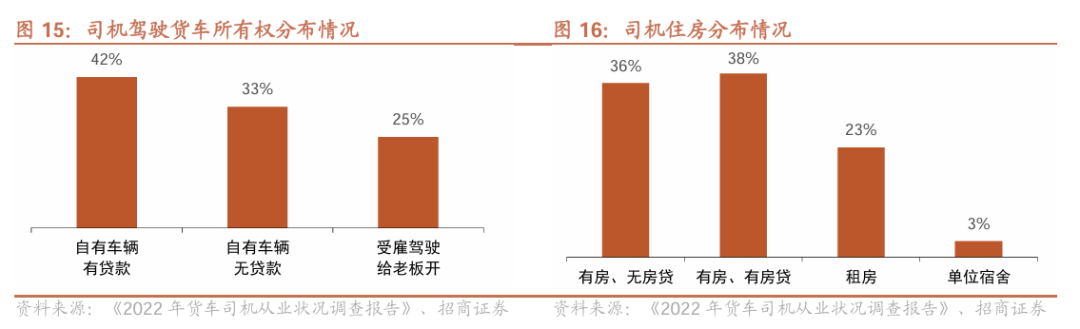 货车司机中自有车辆的个体户占多数,相对独立分散。据《2022年货车司机从业状况调查报告》,约70%+的货车司机均为自有车辆,独立性较强,同时也较为分散。与此同时,司机负担车贷、房贷的比重均将近40%,较大的经济负担下,司机通过平台获取增量订单及收入的意愿度较高。