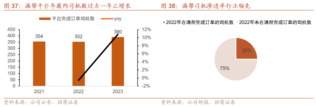 满帮平台司机队伍庞大,运力供给充沛。2023年全年共有390万卡车司机在满帮平台上完成履约,同比增长11%,总履约订单量达到近1.6亿。同时,据公司财报,2022年满帮平台注册司机超1000万,覆盖全国70%的重卡中卡司机。其中,2022年在满帮完成订单的司机为352万,占同期全国重卡中卡司机总人数的25%。平台司机队伍庞大,运力充足。