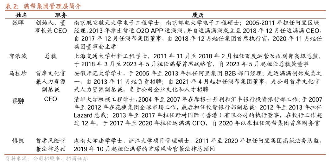 多位管理层曾就职于阿里,从业经验丰富。公司多位高管曾就职于阿里巴巴,CEO 张晖曾任阿里巴巴区域运营和销售高级客户经理;首席风险官、法律总顾问慎凯曾任阿里巴巴高级法律董事;首席客户官王正洪曾任阿里巴巴区域总经理,多位核心高管曾在阿里集团有工作经历。阿里以“销售铁军”闻名,数字货运行业在增加司机供给、实现高效车货匹配的过程中也需要较强的运营及地推能力,预计管理层在阿里的工作经历对公司的运营管理也有一定助益。