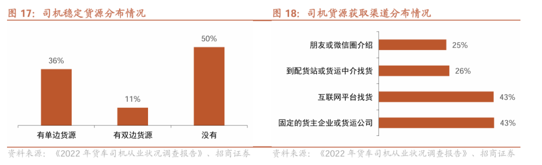 个体司机缺乏稳定客源,对网络平台较为依赖。据《2022年货车司机从业状况调查报告》,约半数司机没有稳定货源,约36%的司机仅有单边货源,带来的司机端运力闲置或空载的情况显著。在缺乏稳定货源的情形下,互联网平台找货的渗透率日渐提升,司机通过互联网平台获取货源的占比达到43%,成为司机找货最为依赖的两大找货渠道之一。