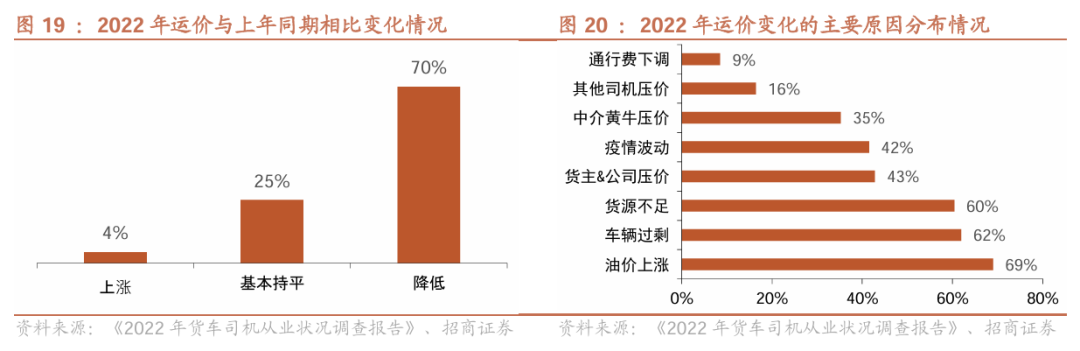 货车司机数量偏饱和,运价承压。当前货源不足背景下,运力侧相对过剩,带来运价的持续走低,据《2022年货车司机从业状况调查报告》,超七成货车司机反映2022年运价相比上年总体降低,主要是受货运需求不足、运力供大于求的影响,运价没有相应上涨乃至下跌。同时,车辆过剩加剧市场低价竞争,货源不足拉低整体价格。