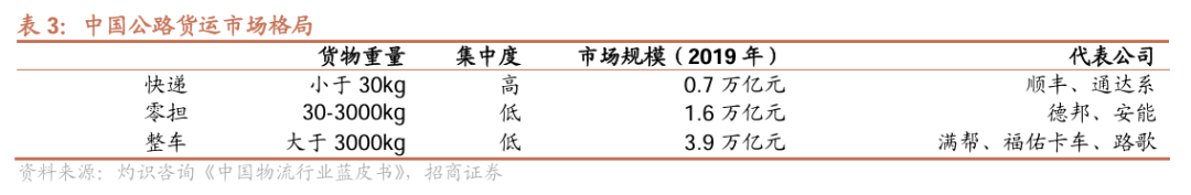 零担及整车市场规模大,集中度低。根据灼识咨询,以2019年计,快递、零担、整车的市场规模占公路货运市场总规模的比例分别为11%、26%、63%,零担+整车货运市场规模庞大。从竞争格局上,快递行业经过近几年的高速发展和激烈竞争,已基本形成顺丰+通达系的寡头垄断局面,市场集中度较高;相应的,零担及整车市场仍呈现出“多小散弱”的发展态势,运输体系呈高度碎片化。