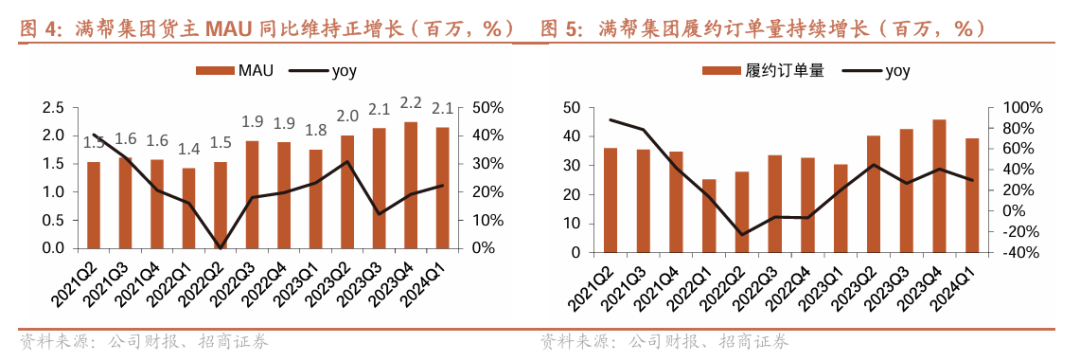 履约订单量持续增长,货主用户粘性强。2023年第四季度满帮履约订单量达4580万单,同比增加40%,达到历史新高。同时,据我们计算,单个货主MAU季度平均履约订单数达到约20单,货主用户的黏性较强。