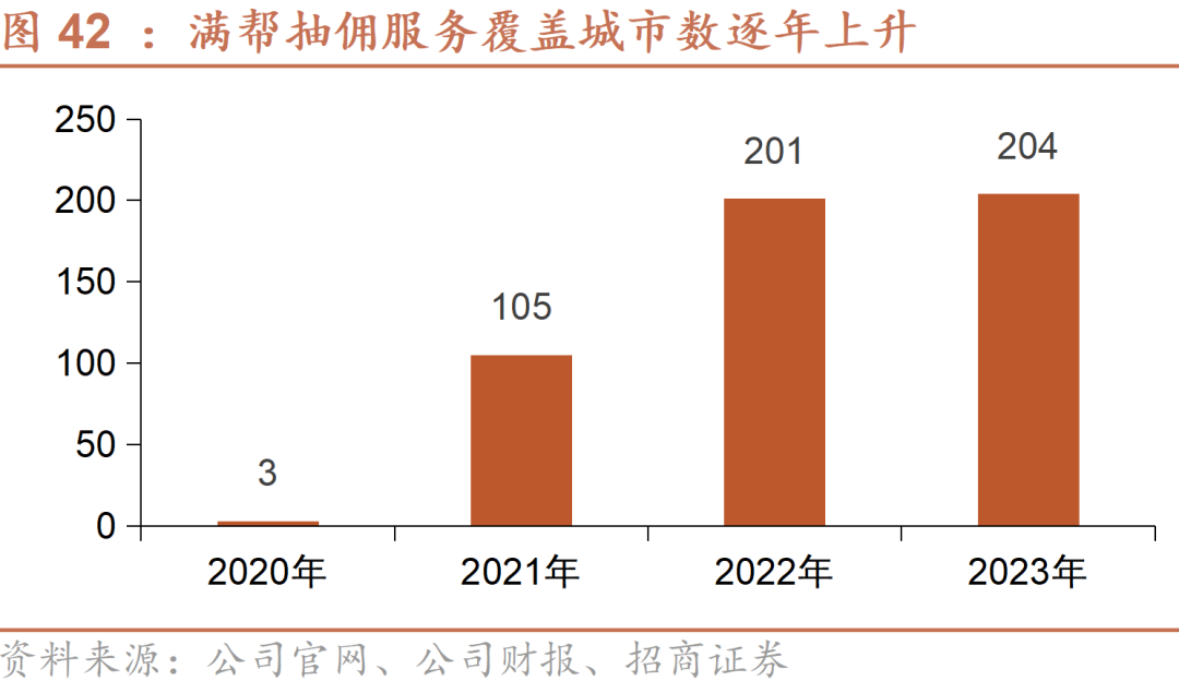 满帮佣金收入高速增长。公司于2020年下半年在杭州、湖州、绍兴中试点佣金收取,对特定类型的运输订单收取货车司机佣金;发现试点城市的日均订单量和货车司机留存率保持稳定,表明司机用户对抽佣的接受度较高。随着平台逐步提升抽佣覆盖城市数及抽佣率水平,平台抽佣收入高速增长;至2023年末,佣金试点业务已迅速拓展至204个城市,总交易佣金收入超过22亿,占总收入的比重达到26%。