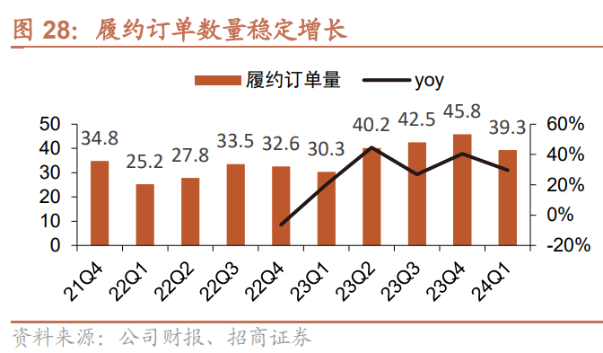 货主MAU及履约单量持续增长。公司24Q1货主MAU达214万/+22.3%,货主用户数持续高增长,为单量增长持续储备动能。司机端看,公司2023年履约活跃司机数量达388万,运力储备充足。公司23全年履约订单达1.6亿,同比增长超33%,单量持续保持高速增长,并带动各项业务收入增长。