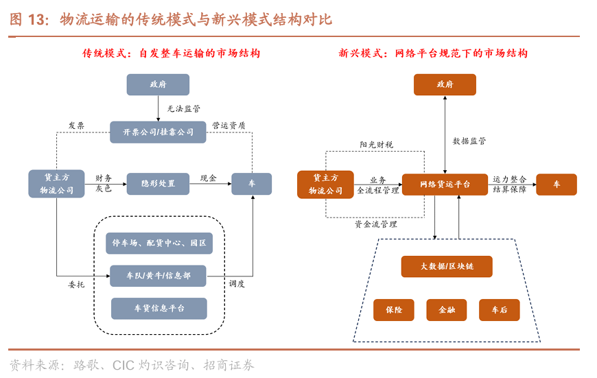 相较于低效的传统模式,平台模式下明显提升车货匹配效率及履约质量。在平台模式下,通过平台形成更广泛的订单池和司机库,双方匹配过程中的信息透明度及匹配效率均明显提升。此外,网络平台的介入也完善了增值服务及售后保障,明显提升了用户体验。