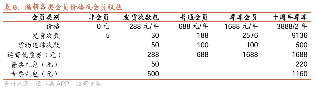 针对不同货主发货频次需求,推出三档主要会员类别。满帮平台针对不同货主需求推出发货次数包、普通会员、尊享会员三类主要会员权益。发货包价格为288元/年,普通会员价格为688元/年,尊享会员价格为1688元/年,三档会员卡对应的年发货次数分别为30次/188次/2576次,依次满足中低频直客货主、中频货主及高频黄牛类货主的发货需求。