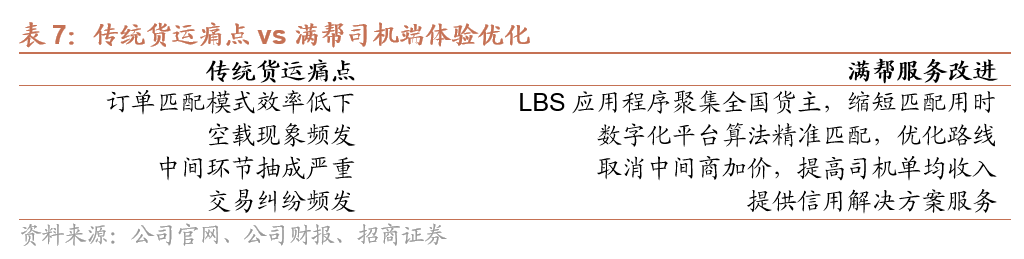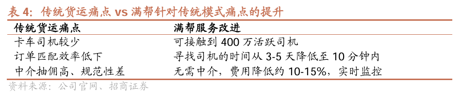 满帮平台针对传统货运模式的痛点做出诸多改进。满帮平台注册司机近400万,车型覆盖全面,能够较好应对货主的多样化物流运输订单需求。同时,满帮通过车货智能匹配完成货主与司机的无缝连接,实现货主高效找车,有效解决传统货运平台配载效率低、行驶线路缺乏规划等问题。此外,由于交易过程更加简化透明,责任的界定清晰,交易的不确定性大大降低,为货主提供了更加稳定和可靠的运输服务。