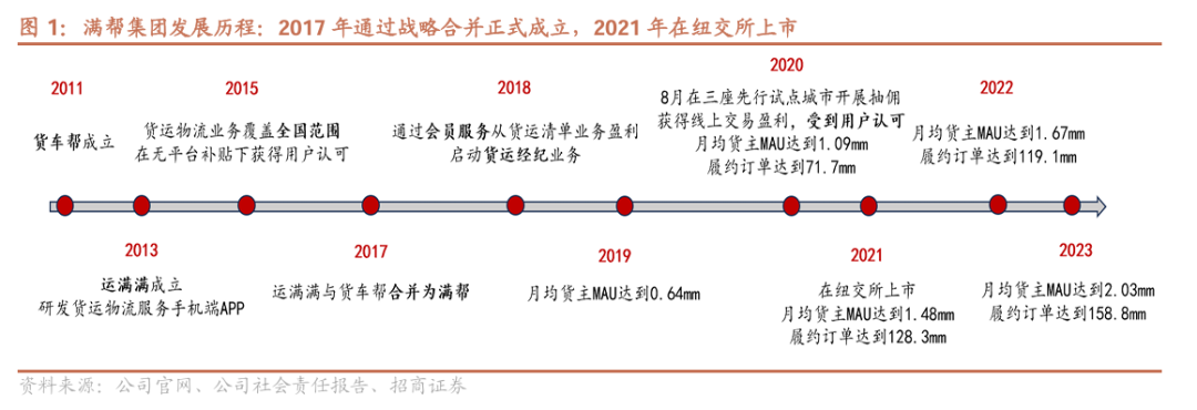 2017年货车帮与运满满合并成立满帮集团,2021年公司在纽交所上市。2011年货车帮成立,2013年运满满成立,2017年两者正式合并为满帮集团。合并后公司不断拓展业务边界,逐步形成经纪+会员+抽佣+增值服务四大商业化路径。公司先于2018年在会员业务之外启动货运经纪业务,随后于2020年开展抽佣试点,并逐步扩大抽佣覆盖城市及抽佣率,实现佣金收入的可观增长。在变现侧表现不断提升的同时,公司用户数及订单量亦持续高增长,至24Q1,满帮平台货主月活达214万,季度履约订单量达4000万单。