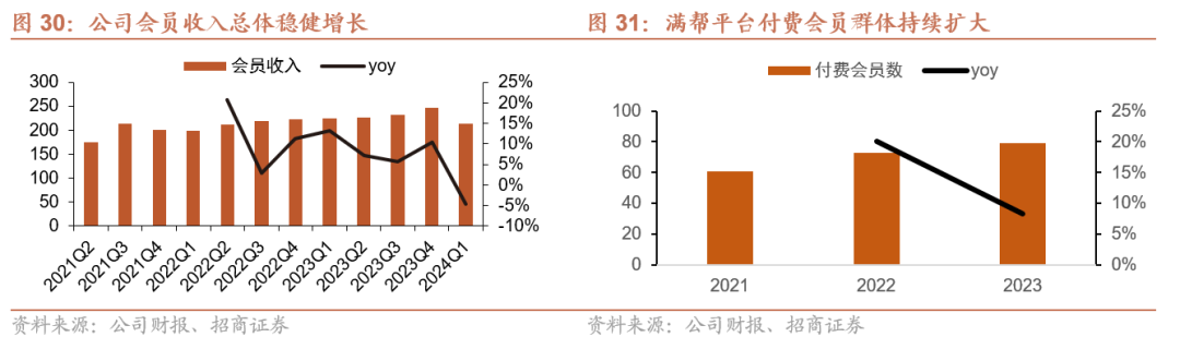 毛利率逐年提升,随经营杠杆释放,各项费用率下降。随着公司业务结构的变化,高毛利的会员、抽佣及增值服务收入占比提升带动公司毛利率持续上涨,2023年全年毛利率达到51.2%,较2022年提升3.4pct。同时,随着公司规模的扩大,各项费用率亦呈现逐步下降趋势,2023年公司费用率合计25.8%,较2022年下降17.2pct。