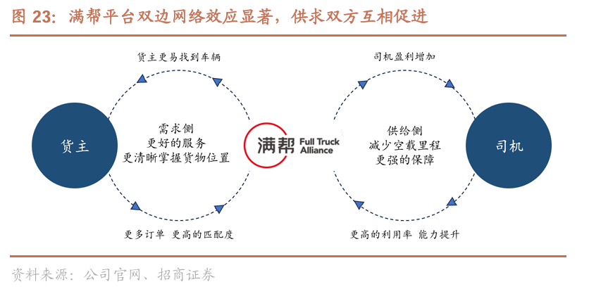 满帮集团连接司机及货主两端,双边网络效应显著。满帮同时服务于货主与司机两端,随着货主数量增加,平台单量增长,司机更容易获得订单及提升收入,将吸引更多司机入驻平台;同时更多货车司机的入驻也将提供更多运力,使得货主能更快找到更为合适的货车司机,从而继续带动货主数量的增长,形成司机增长—货主增长—司机增长—……的飞轮。