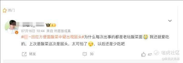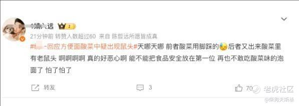 「什么每次出事的都是老坛酸菜面 我还挺爱吃的,上次是酸菜这次是鼠头,太可怕了,以后还是少吃吧」