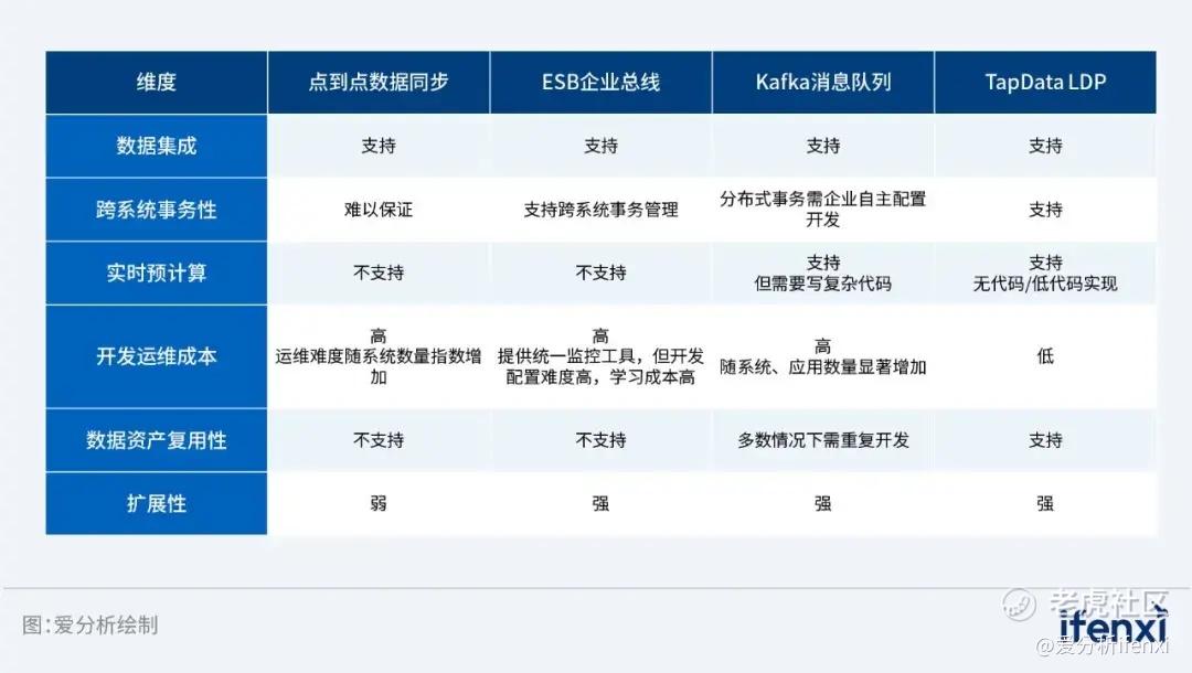 表2:点到点数据同步、ESB企业总线、Kafka消息队列以及TapData LDP四种解决方案对比