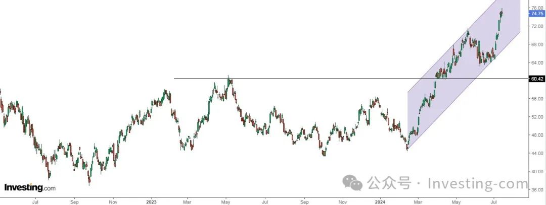 5月9日,Agnico Eagle Mines Limited (NYSE:AEM)开市报66.67美元,当时笔者就认为其潜力可达73.18美元,而现在该股已经超越这一目标,目前股价在75美元附近。