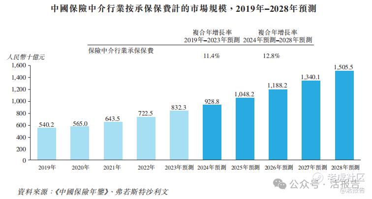 近年来,中国保险中介行业经历了显著增长。按承保保费计算,中国保险中介行业市场规模从2019年的人民币5402亿元增加到2023年的人民币8323亿元,平均复合年增长率为11.4%。随着保险行业的规范、有序发展,预计未来中国保险中介行业也将保持快速增长趋势。预计到2028年,中国保险中介行业承保保费规模将达到人民币15,055亿元,自2024年起,复合年增长率将达到12.8%。