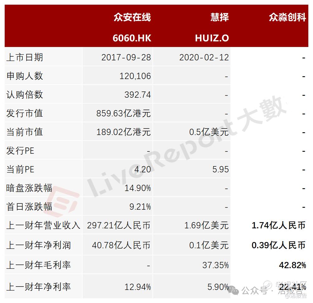 本次选取的同行业对比公司为:众安在线(6060.HK)、慧择(HUIZ.O)