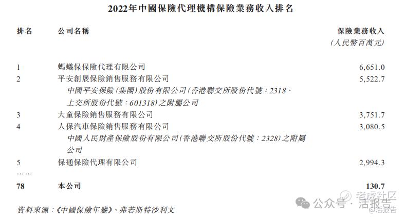 于2022年,公司的保险业务收入(即代表保险公司根据保单持有人保费分销保险产品所赚取的佣金收入)为人民币130.7百万元,在中国所有保险代理机构中排名第78位。
