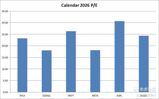 与其他一些大盘股科技公司相比,奈飞的股价并没有那么贵。在下图中,你可以看到其他五家巨头——Alphabet 、微软、Meta、苹果和亚马逊——根据它们2026年的华尔街预估每股收益计算的市盈率。