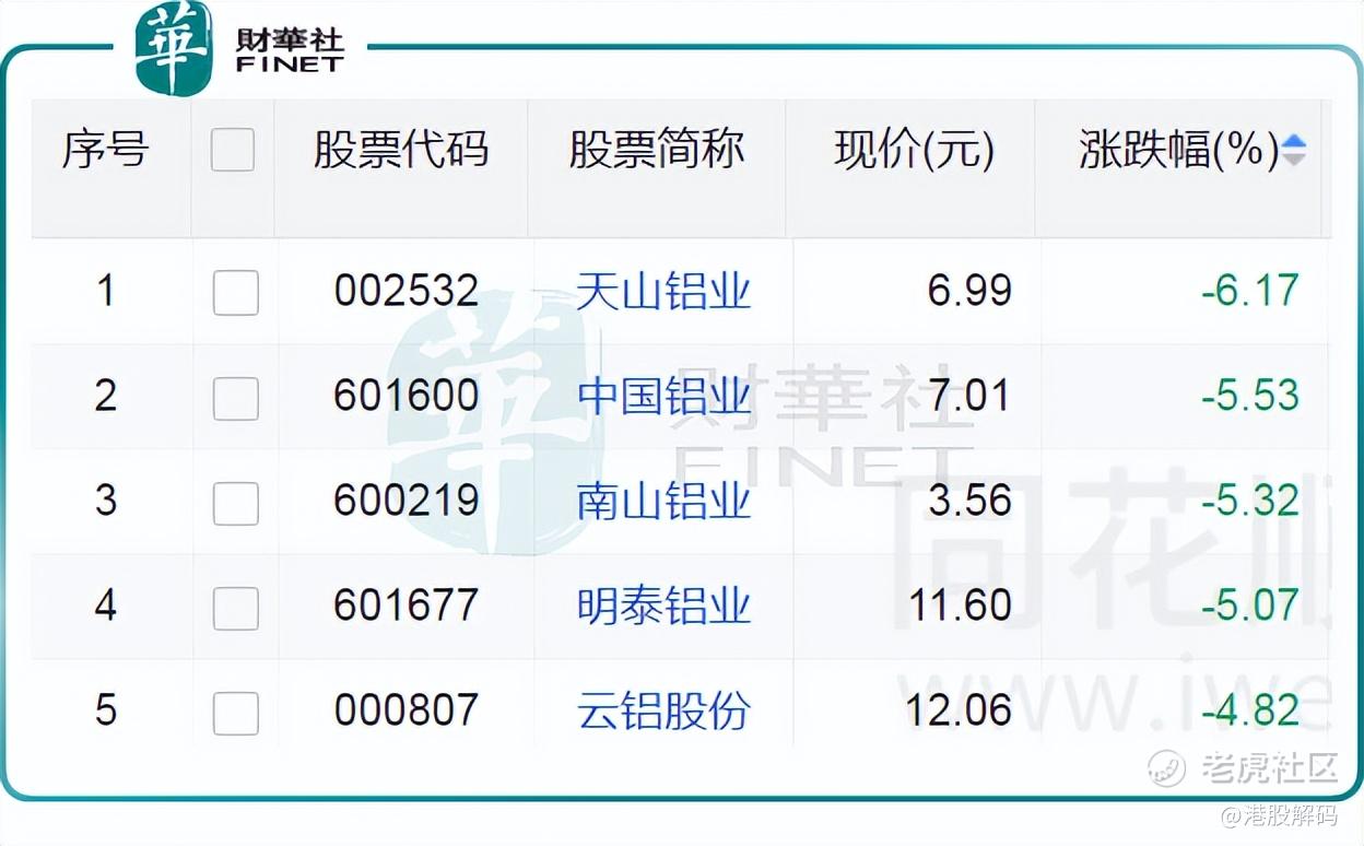 7月23日,铝业股再度集体下挫。其中, $天山铝业(002532)$ 跌6.17%, $南山铝业(600219)$ 下跌5.32%, $明泰铝业(601677)$ 跌5.07%,云铝股份(000807.SZ)跌4.82%,中国铝业(601600.SH)(02600.HK)A股及港股股价亦双双下行,A股跌5.53%,H股跌6.81%。