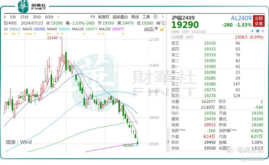 期货方面,7月23日,沪铝主力合约收报 19290元/吨,较上一交易日下跌260元/吨。