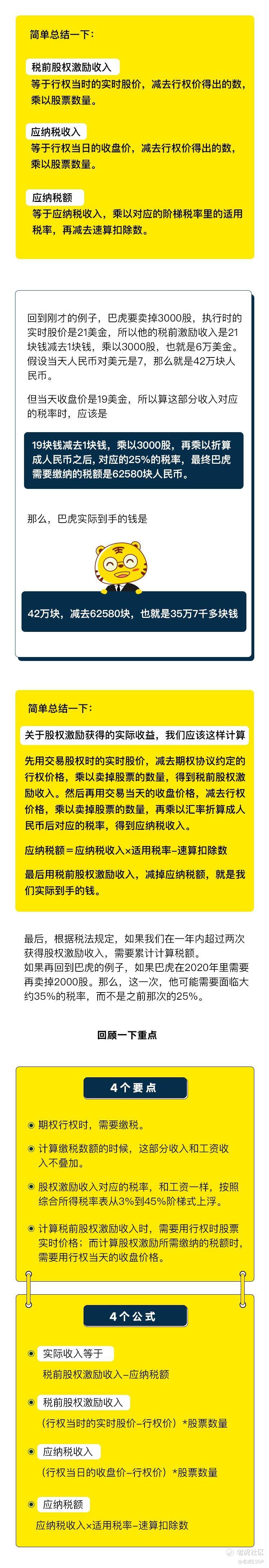 回到刚才的例子,巴虎要卖掉3000股,执行时的实时股价是21美金,所以他的税前激励收入是21块钱减去1块钱,乘以3000股,也就是6万美金。假设当天人民币对美元是7,那么就是42万块人民币。
