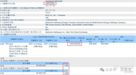 7月22日,港交所披露文件显示,巴菲特旗下伯克希尔·哈撒韦公司于7月16日减持139.55万股比亚迪股份。