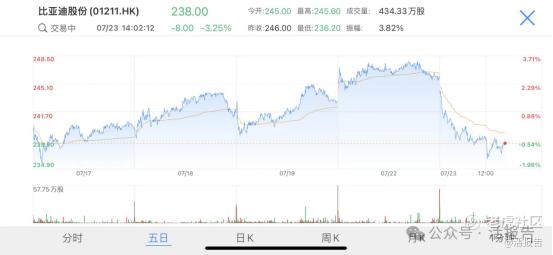 今日(7月23日),比亚迪股份(1211.HK)开盘下跌0.41%。截至本文编撰时,比亚迪股份报238港元,跌3.25%。