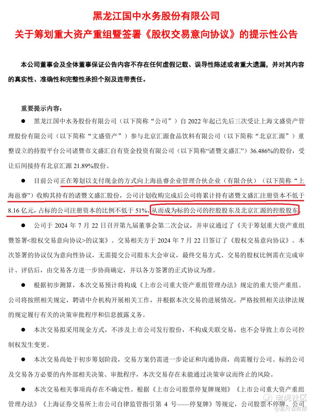 两家的故事得从几年前说起,当时的国中水务业绩每况愈下,在辗转寻求业务转型的当口,碰到了退市重整、债务缠身的北京汇源。2022年底,国中水务豪掷8.5亿拿下北京汇源18.89%股权。随后又再度加码8000万,对北京汇源的持股上升至21.89%。