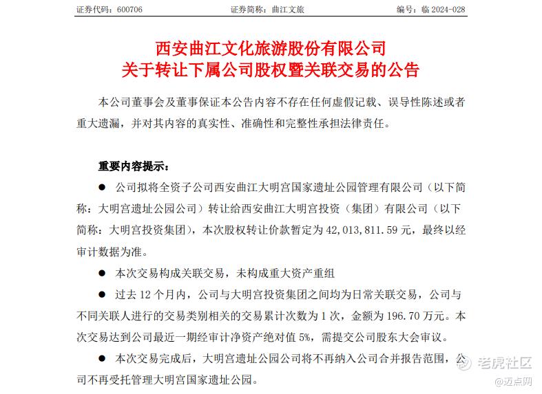 6月7日,曲江文旅宣布拟将全资子公司西安曲江大明宫国家遗址公园管理有限公司100%股权转让给西安曲江大明宫投资(集团)有限公司,股权转让价款初步定为4201.38万元。由于大明宫投资集团为曲江文旅第一大股东的母公司与西安曲江文化控股有限公司共同出资设立,因此该交易属于关联交易。