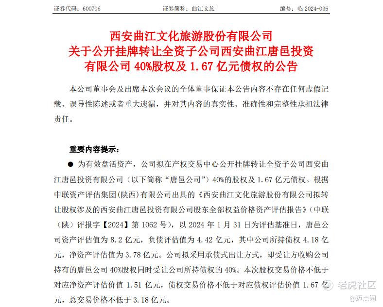 近日,曲江文旅(SH:600706)发布公告称,公司拟公开挂牌转让全资子公司西安曲江唐邑投资有限公司40%的股权及1.67亿元债权。本次交易拟采用承债式出让方式,即受让方收购曲江文旅持有的唐邑公司40%股权,同时受让曲江文旅所持债权的40%。
