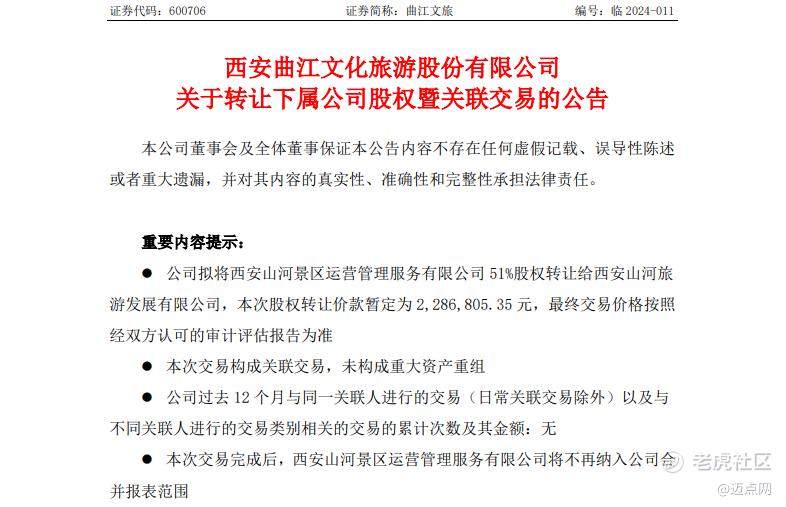 4月19日,曲江文旅宣布将其持有的西安山河景区运营管理服务有限公司51%的股权转让给西安山河旅游发展有限公司,股权转让价格暂定为228.68万元。由于山河发展公司为曲江文旅控股股东西安曲江旅游投资(集团)有限公司的全资子公司,因此该交易属于关联交易。