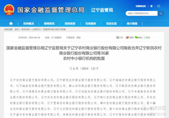 就在上个月,6月20日,辽宁农村商业银行获批吸收合并辽宁新民农村商业银行等36家农村中小银行机构。