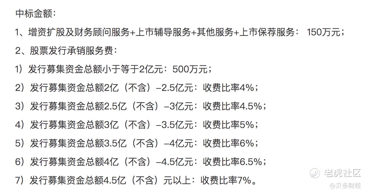 同时,中标信息还披露了中标金额。其中,增资扩股及财务顾问服务+上市辅导服务+其他服务+上市保荐服务共150万元。若发行募集资金总额不高于2亿元,收取承销服务费500万元;若超过2亿元,收费比率范围为4%至7%不等。
