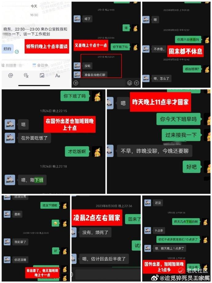 据去世追觅员工家属发文表示,其丈夫于2023年8月入职追觅科技有限公司,此后便陷入了长期高强度的加班工作。其提供的聊天记录截图中,显示有多次加班的情况。“领导约晚上十点半面谈”“周末都不休息”“国外出差,加班加到晚上一点多”“凌晨2点左右到家”……