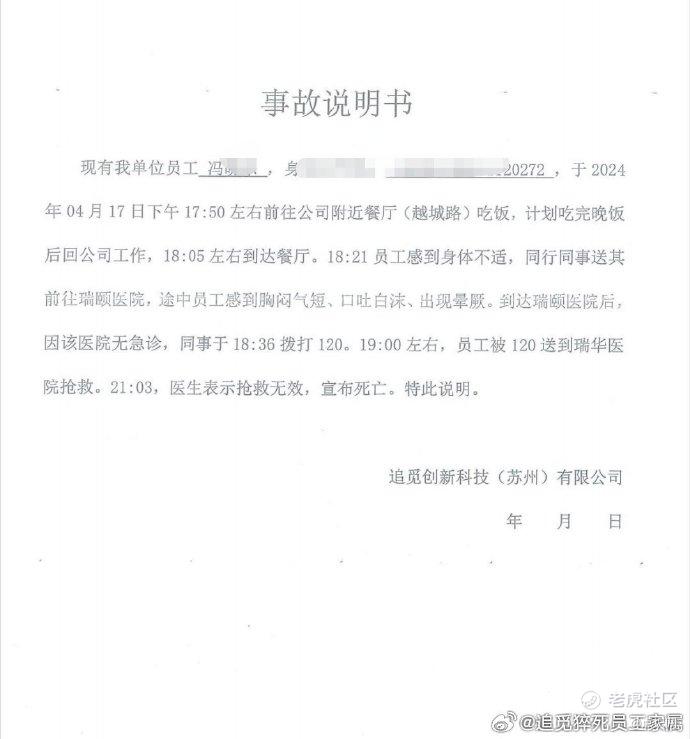 家属发文表示,2024年4月17日冯先生前往公司附近餐厅吃饭,计划吃完晚饭后回公司工作。其在到达餐厅后不久感到身体不适,同行同事送其前往医院,途中出现胸闷气短、口吐白沫、晕厥的症状。因首次到达的医院无急诊,后被送到另一所医院抢救。晚九点医生表示抢救无效,宣布死亡。