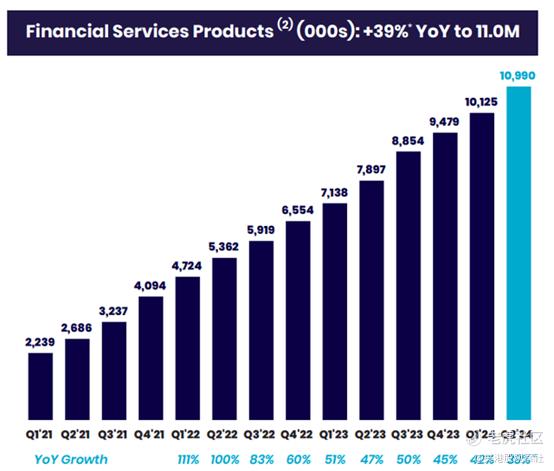 关键驱动因素再次是推出新的(个人理财)产品,这些产品在平台成员中得到了热烈的欢迎。SoFi平台提供的产品总数为12,776种,同比增长36%。这一增长主要是由SoFi的金融服务产品(同比增长39%)推动的,其增长速度是该平台贷款产品(同比增长19%)的两倍多。