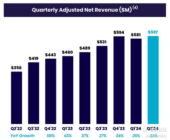 SoFi的金融服务产品也推动了SoFi收入的飙升。在24年第二季度,公司报告了有史以来最高的季度净收入,达到5.97亿美元,同比增长22%。尽管收入增长率有所放缓,但SoFi在吸引新客户进入其个人理财生态系统方面取得了广泛成功。在这种增长势头的背景下,公司也再次提高了对2024财年的指引。