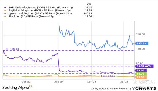 SoFi目前的股价市盈率为39.1倍,这可能看起来很高,但这家金融科技公司在去年年底才实现了GAAP盈利——SoFi 24年第二季度只是连续第三个季度实现GAAP盈利。这意味着SoFi的利润增长曲线可能会比PayPal陡峭得多,而市场的普遍预期也表明了这一点:SoFi明年的每股收益预计将增长145%,而PayPal的年增长率为8%。