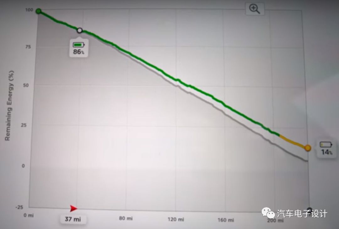 而Tesla则进一步把每次行程按照需求的动态过程来图示化这个过程,通过这个坐标轴一样的形式表达出来。用户可以把SOC和里程的对应关系找出来,配上自己的驾驶习惯来读取每次行程的统计。通过这根曲线,就可以让用户理解SOC和续航里程的联系。