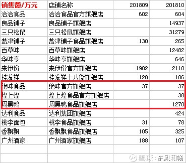 以下图为例,网友对休闲食品在天猫店上的销售额统计,2018年10月,周黑鸭销售额是其余两家的30多倍。