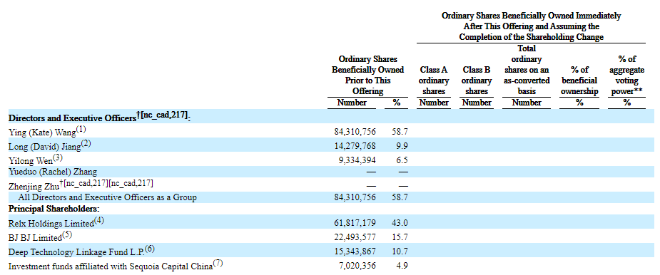 蒋龙Jiang Long (David)持股9.9%,闻一龙Wen Yilong持股6.5%;源码资本持股10.7%;红杉持股4.9%。