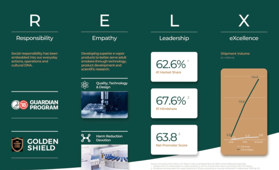 悦刻品牌电子雾化器的研发、设计、和销售。根据CIC报告,按零售额计算,在2019年和截至2020年9月30日的前三季度,该公司是中国排名第一的电子烟品牌,市场份额分别为48.0%和62.6%。