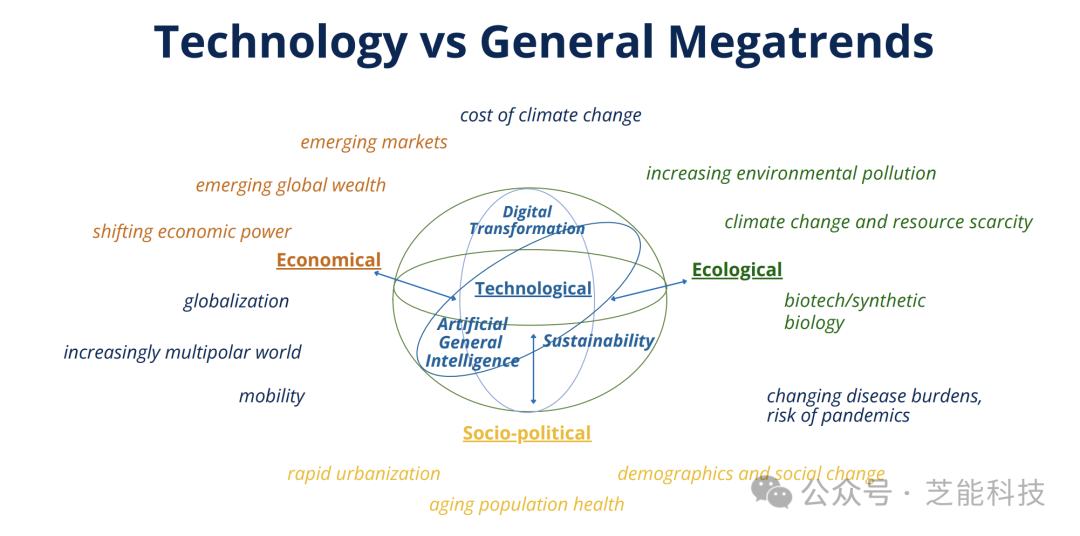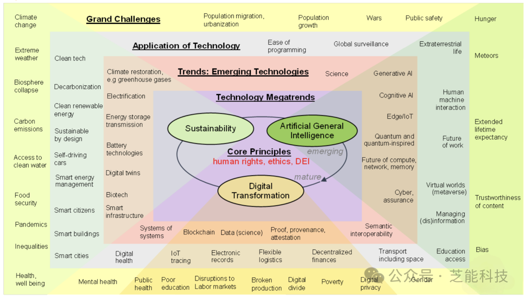 报告主要探讨了三个中心主题:数字化转型(DT)、可持续性和通用人工智能(AGI)。每个大趋势都涵盖了许多技术,这些技术有望深刻影响经济、生态和社会领域。