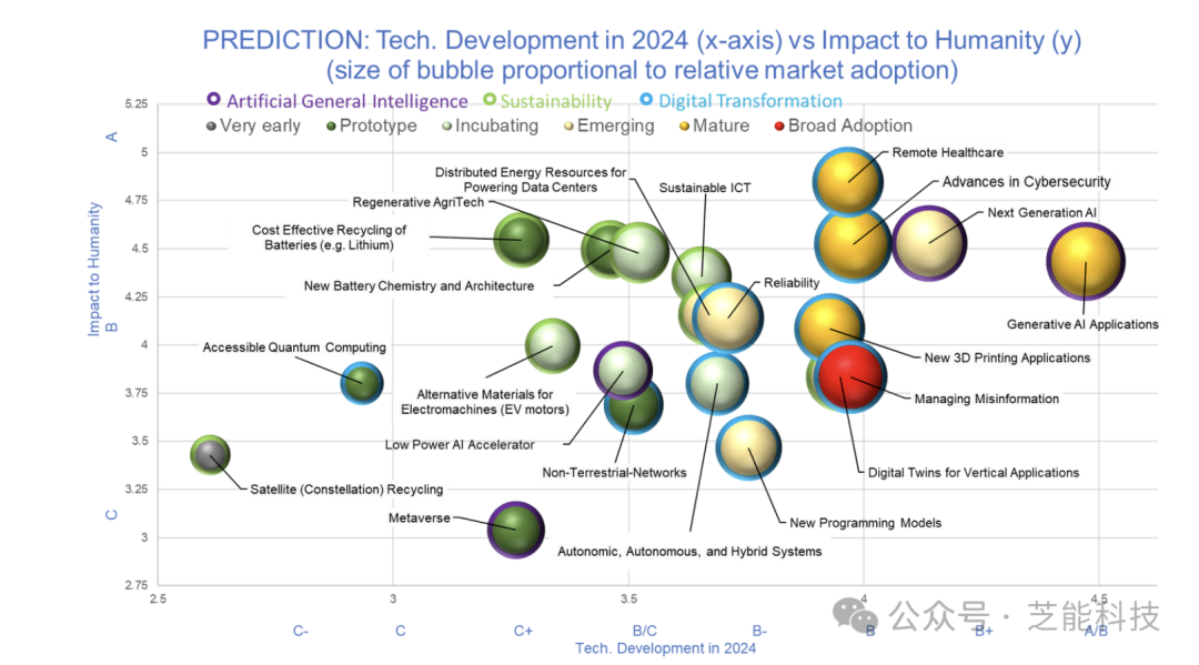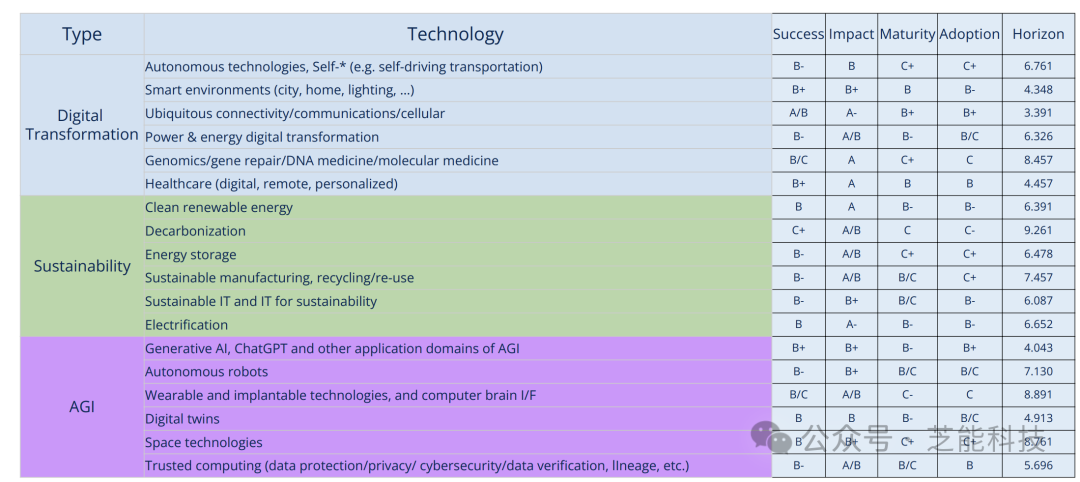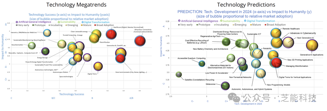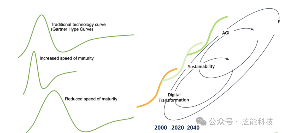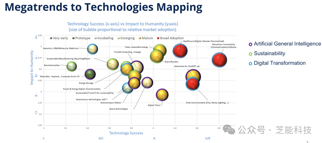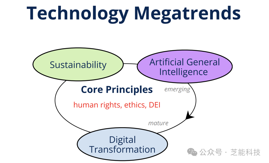 AGI将继续显著支持其他大趋势和技术。可持续性将渗透到所有垂直和水平技术中,成为普遍关注的问题。数字化转型将显著影响可以通过数字方式自动化或增强的技术。